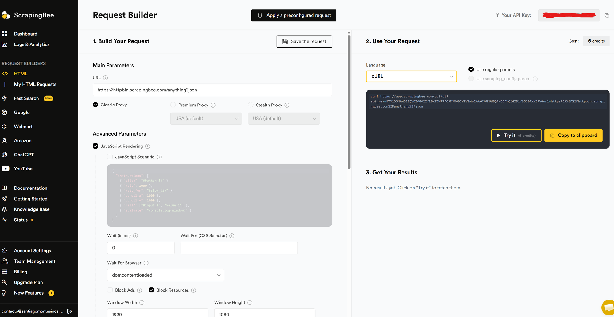 ScrapingBee isn’t just API-first—they also have a web interface that lets you: