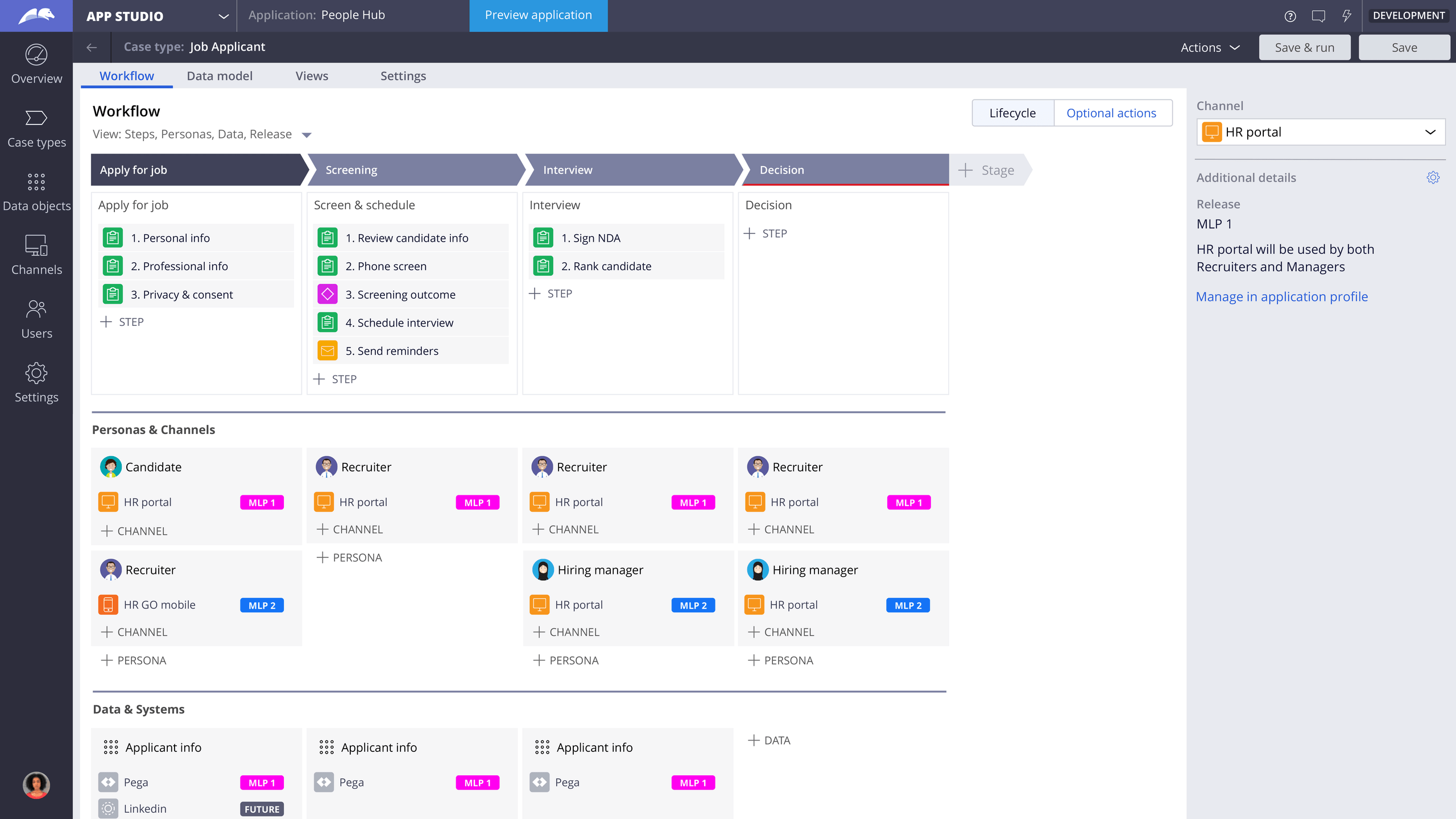Developing software this way is a huge change of paradigm for me. Pega is a low-code/no-code platform. This means you build an application in a visual manner, mostly through models, without using code. When your create an app using Pega, the platform itself writes its own code.